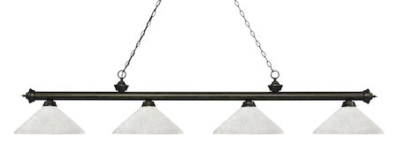 Finished in golden bronze this four light bar fixture uses angle white linen glass shades to create a contemporary look with a timeless quality to it. This fixture would be perfect for the game room, or any other room of the house where a touch of under stated sophistication is needed.
