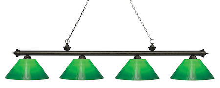 Finished in golden bronze this four light bar fixture uses green cased glass shades to create a contemporary look with a timeless quality to it. This fixture would be perfect for the game room, or any other room of the house where a touch of under stated sophistication is needed.
