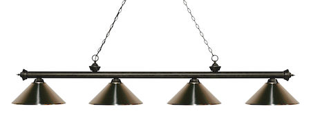 Finished in golden bronze this four light bar fixture uses brushed nickel metal shades to create a contemporary look with a timeless quality to it. This fixture would be perfect for the game room, or any other room of the house where a touch of under stated sophistication is needed.