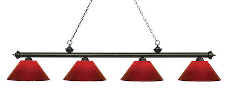 Finished in golden bronze this four light bar fixture uses red plastic shades to create a contemporary look with a timeless quality to it. This fixture would be perfect for the game room, or any other room of the house where a touch of under stated sophistication is needed.