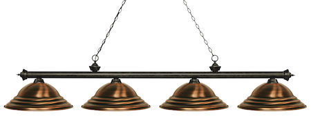 Finished in golden bronze this four light bar fixture uses stepped antique copper shades to create a contemporary look with a timeless quality to it. This fixture would be perfect for the game room, or any other room of the house where a touch of under stated sophistication is needed.