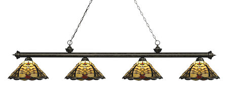 Finished in golden bronze this four light bar fixture uses multi-coloured tiffany glass shades to create a contemporary look with a timeless quality to it. This fixture would be perfect for the game room, or any other room of the house where a touch of under stated sophistication is needed.