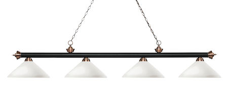 Finished in matte black and antique copper this four light bar fixture uses angle mottle opal glass shades to create a contemporary look with a timeless quality to it. This fixture would be perfect for the game room, or any other room of the house where a touch of under stated sophistication is needed.