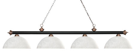 Finished in matte black and antique copper this four light bar fixture uses dome white linen glass shades to create a contemporary look with a timeless quality to it. This fixture would be perfect for the game room, or any other room of the house where a touch of under stated sophistication is needed.
