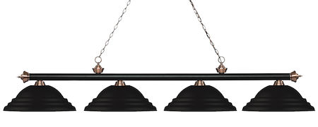 Finished in matte black and antique copper this four light bar fixture uses stepped matte black metal shades to create a contemporary look with a timeless quality to it. This fixture would be perfect for the game room, or any other room of the house where a touch of under stated sophistication is needed.