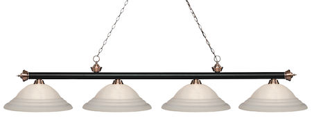 Finished in matte black and antique copper this four light bar fixture uses white swirl glass shades to create a contemporary look with a timeless quality to it. This fixture would be perfect for the game room, or any other room of the house where a touch of under stated sophistication is needed.