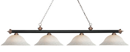 Finished in matte black and antique copper this four light bar fixture uses white mottle glass shades to create a contemporary look with a timeless quality to it. This fixture would be perfect for the game room, or any other room of the house where a touch of under stated sophistication is needed.