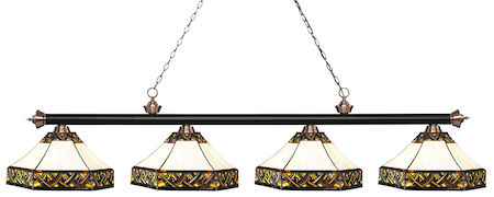 Finished in matte black and antique copper this four light bar fixture uses multi-coloured tiffany glass shades to create a contemporary look with a timeless quality to it. This fixture would be perfect for the game room, or any other room of the house where a touch of under stated sophistication is needed.