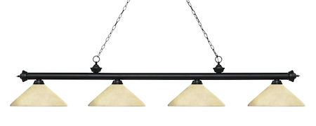 Finished in matte black this four light bar fixture uses angle golden mottle glass shades to create a contemporary look with a timeless quality to it. This fixture would be perfect for the game room, or any other room of the house where a touch of under stated sophistication is needed.