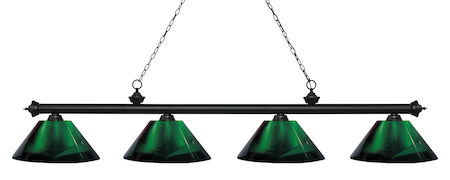 Finished in matte black this four light bar fixture uses green acrylic shades to create a contemporary look with a timeless quality to it. This fixture would be perfect for the game room, or any other room of the house where a touch of under stated sophistication is needed.