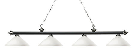 Finished in matte black and brushed nickel this four light bar fixture uses angle mottle opal glass shades to create a contemporary look with a timeless quality to it. This fixture would be perfect for the game room, or any other room of the house where a touch of under stated sophistication is needed.