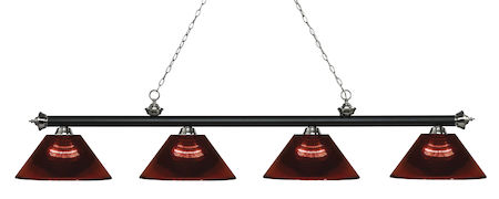 Finished in matte black and brushed nickel this four light bar fixture uses burgandy acrylic shades to create a contemporary look with a timeless quality to it. This fixture would be perfect for the game room, or any other room of the house where a touch of under stated sophistication is needed.