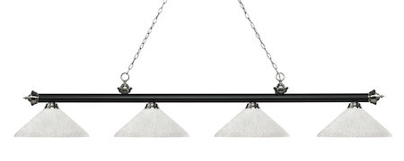 Finished in matte black and brushed nickel this four light bar fixture uses angle white linen glass shades to create a contemporary look with a timeless quality to it. This fixture would be perfect for the game room, or any other room of the house where a touch of under stated sophistication is needed.