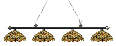 Finished in matte black and brushed nickel this four light bar fixture uses multi-coloured tiffany glass shades to create a contemporary look with a timeless quality to it. This fixture would be perfect for the game room, or any other room of the house where a touch of under stated sophistication is needed.