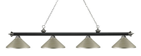 Finished in matte black and brushed nickel this four light bar fixture uses antique silver metal shades to create a contemporary look with a timeless quality to it. This fixture would be perfect for the game room, or any other room of the house where a touch of under stated sophistication is needed.