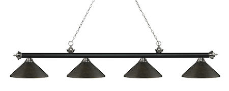 Finished in matte black and brushed nickel this four light bar fixture uses golden bronze metal shades to create a contemporary look with a timeless quality to it. This fixture would be perfect for the game room, or any other room of the house where a touch of under stated sophistication is needed.