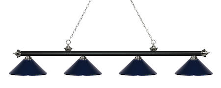 Finished in matte black and brushed nickel this four light bar fixture uses navy blue metal shades to create a contemporary look with a timeless quality to it. This fixture would be perfect for the game room, or any other room of the house where a touch of under stated sophistication is needed.