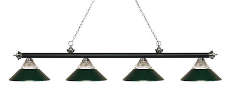 Finished in matte black and brushed nickel this four light bar fixture uses clear ribbed glass and dark green metal shades to create a contemporary look with a timeless quality to it. This fixture would be perfect for the game room, or any other room of the house where a touch of under stated sophistication is needed.