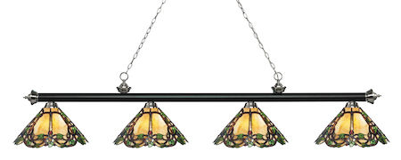 Finished in matte black and brushed nickel this four light bar fixture uses multi-coloured tiffany glass shades to create a contemporary look with a timeless quality to it. This fixture would be perfect for the game room, or any other room of the house where a touch of under stated sophistication is needed.
