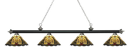 Finished in matte black and brushed nickel this four light bar fixture uses multi-coloured tiffany glass shades to create a contemporary look with a timeless quality to it. This fixture would be perfect for the game room, or any other room of the house where a touch of under stated sophistication is needed.