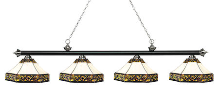 Finished in matte black and brushed nickel this four light bar fixture uses multi-coloured tiffany glass shades to create a contemporary look with a timeless quality to it. This fixture would be perfect for the game room, or any other room of the house where a touch of under stated sophistication is needed.