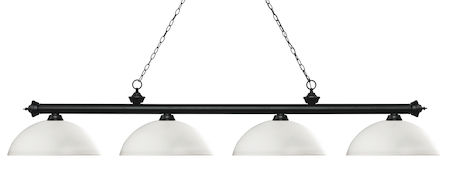 Finished in matte black this four light bar fixture uses dome matte opal glass shades to create a contemporary look with a timeless quality to it. This fixture would be perfect for the game room, or any other room of the house where a touch of under stated sophistication is needed.