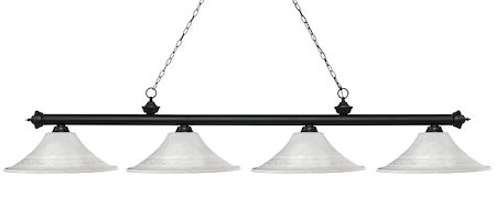 Finished in matte black this four light bar fixture uses fluted white mottle glass shades to create a contemporary look with a timeless quality to it. This fixture would be perfect for the game room, or any other room of the house where a touch of under stated sophistication is needed.