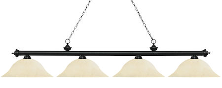 Finished in matte black this four light bar fixture uses golden mottle glass shades to create a contemporary look with a timeless quality to it. This fixture would be perfect for the game room, or any other room of the house where a touch of under stated sophistication is needed.