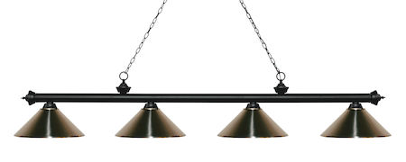 Finished in matte black this four light bar fixture uses brushed nickel metal shades to create a contemporary look with a timeless quality to it. This fixture would be perfect for the game room, or any other room of the house where a touch of under stated sophistication is needed.