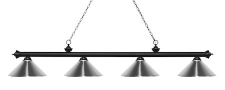 Finished in matte black this four light bar fixture uses chrome metal shades to create a contemporary look with a timeless quality to it. This fixture would be perfect for the game room, or any other room of the house where a touch of under stated sophistication is needed.