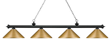 Finished in matte black this four light bar fixture uses satin gold metal shades to create a contemporary look with a timeless quality to it. This fixture would be perfect for the game room, or any other room of the house where a touch of under stated sophistication is needed.
