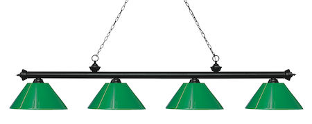 Finished in matte black this four light bar fixture uses green plastic shades to create a contemporary look with a timeless quality to it. This fixture would be perfect for the game room, or any other room of the house where a touch of under stated sophistication is needed.