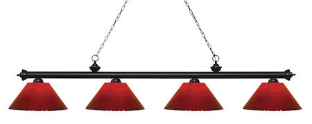 Finished in matte black this four light bar fixture uses red plastic shades to create a contemporary look with a timeless quality to it. This fixture would be perfect for the game room, or any other room of the house where a touch of under stated sophistication is needed.