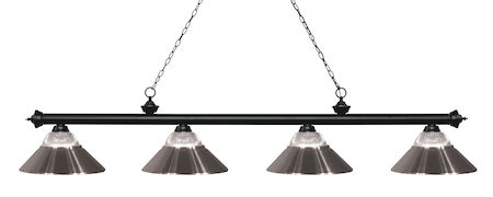 Finished in matte black this four light bar fixture uses clear ribbed glass and brushed nickel metal shades to create a contemporary look with a timeless quality to it. This fixture would be perfect for the game room, or any other room of the house where a touch of under stated sophistication is needed.