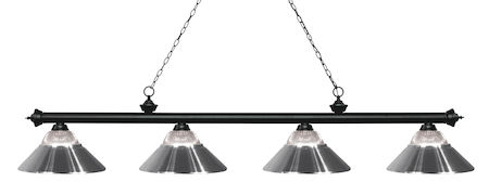 Finished in matte black this four light bar fixture uses clear ribbed glass and chrome metal shades to create a contemporary look with a timeless quality to it. This fixture would be perfect for the game room, or any other room of the house where a touch of under stated sophistication is needed.