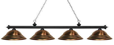 Finished in matte black this four light bar fixture uses stepped antique copper shades to create a contemporary look with a timeless quality to it. This fixture would be perfect for the game room, or any other room of the house where a touch of under stated sophistication is needed.
