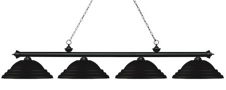 Finished in matte black this four light bar fixture uses stepped matte black metal shades to create a contemporary look with a timeless quality to it. This fixture would be perfect for the game room, or any other room of the house where a touch of under stated sophistication is needed.