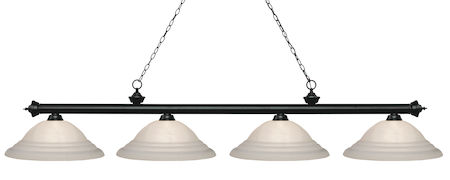 Finished in matte black this four light bar fixture uses white swirl glass shades to create a contemporary look with a timeless quality to it. This fixture would be perfect for the game room, or any other room of the house where a touch of under stated sophistication is needed.
