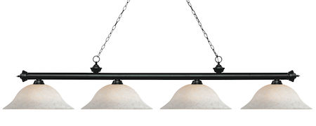 Finished in matte black this four light bar fixture uses white mottle glass shades to create a contemporary look with a timeless quality to it. This fixture would be perfect for the game room, or any other room of the house where a touch of under stated sophistication is needed.