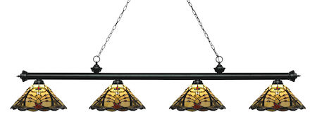 Finished in matte black this four light bar fixture uses multi-coloured tiffany glass shades to create a contemporary look with a timeless quality to it. This fixture would be perfect for the game room, or any other room of the house where a touch of under stated sophistication is needed.