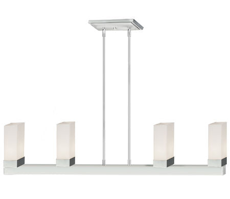 This geometrically inspired four light pendant uses rectangular matte opal shades in combination with rectangular inspired chrome hardware to create a boldly contemporary statement. Adjustable rods are included to ensure the perfect hanging height.