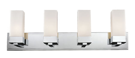 This geometrically inspired four light vanity uses rectangular matte opal shades in combination with rectangular inspired chrome hardware to create a boldly contemporary statement.