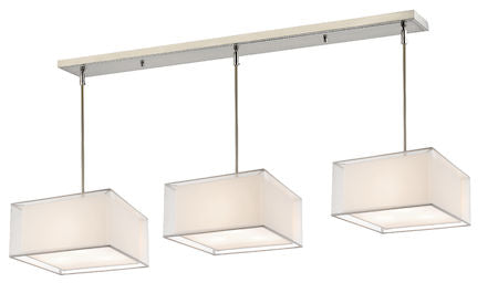 This gorgeous square nine light fixture offers a soft reflection of contemporary life in the every day. The white transparent outer organza shade allows a glimpse of the ultra white inner shade which emanates a soft glow. The Sedona family is finished with brushed nickel hardware.