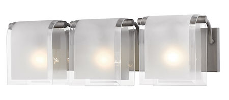 Bent frosted glass shades are hung over factory bronze hardware on this 3 light vanity to create a modern touch for any room.